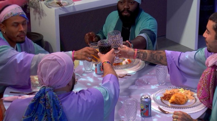 Em seguida, os confinados brindam celebrando o almoço.