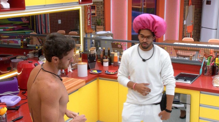 Os brothers Lucas e Luciano conversam na cozinha da casa sobre opções de voto.