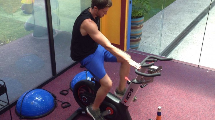 Após mais de 12h de Prova de Imunidade Americanas, onde fez dupla com Luciano, Lucas decide ir pedalar sozinho na academia.