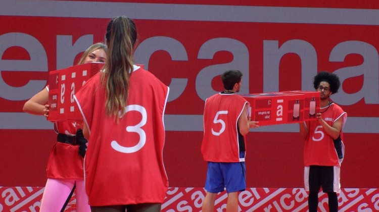 "Ao ouvir a campainha Americanas, o cronômetro vai iniciar e cada dupla deverá pegar nas esteiras quatro cubos, sendo dois de cada produto, conforme indicação nas telas. Antes que o tempo termine, a dupla deverá estar em suas bases com os quatro cubos juntos e enfileirados, sem deixá-los cair no chão. A partir desse momento, quando o cronômetro zerar, cada participante só pode encostar no cubo que estiver mais próximo dele. Ou seja, se ele encostar em qualquer outro cubo que não seja o mais próximo dele, a dupla estará eliminada. Quando a campainha Americanas tocar novamente, cada dupla poderá descartar os cubos e pegar os novos produtos na esteira. Vence a última dupla que permanecer na prova".