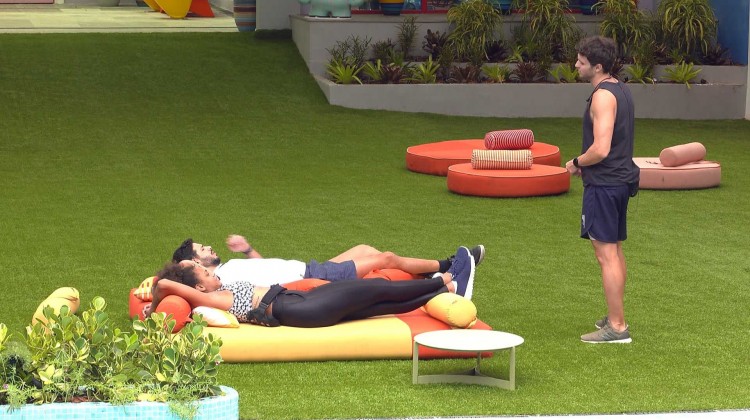 Lucas e Rodrigo seguem para a área externa da casa e o gerente comercial já começa a falar sobre a votação: “99% de chance de eu ir pelo Tiago [Abravanel]. É impressionante quando uma pessoa vai votar em você, ela não olha mais pra você...”.