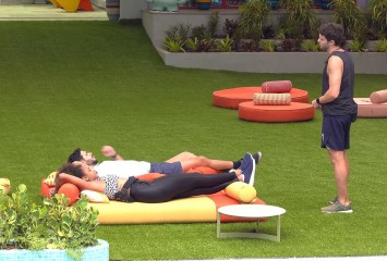 Tiago Abravanel e Naiara Azevedo sentam na varanda um pouco antes da Prova do Anjo e seguem convers...