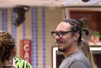 Bárbara faz penteado em Eliezer. A sister pega um pote de gel e começa a passar na cabeça do bro...