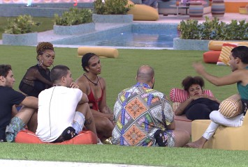 Na área externa da casa, Jade Picon emplaca conversa com Tiago Abravanel e Arthur Aguiar sobre a d...